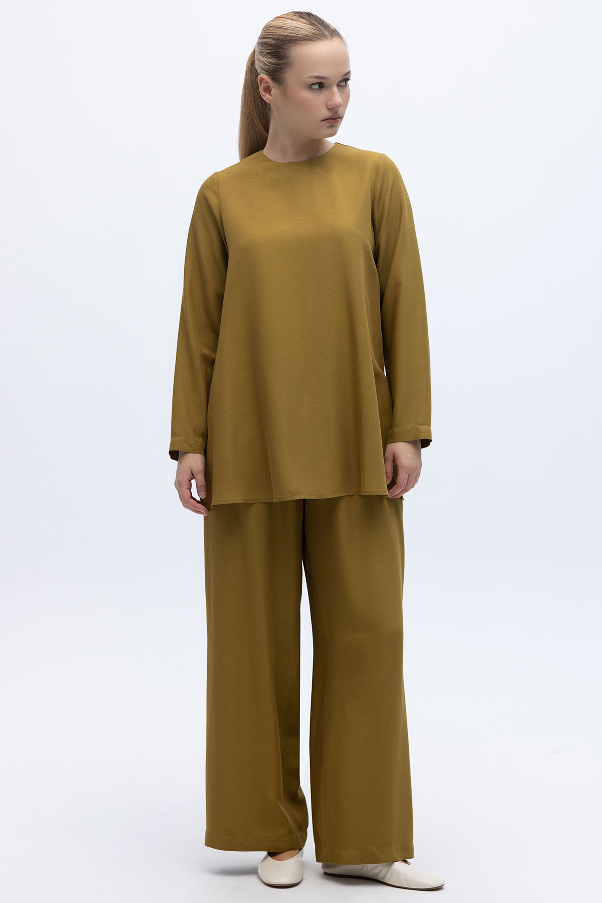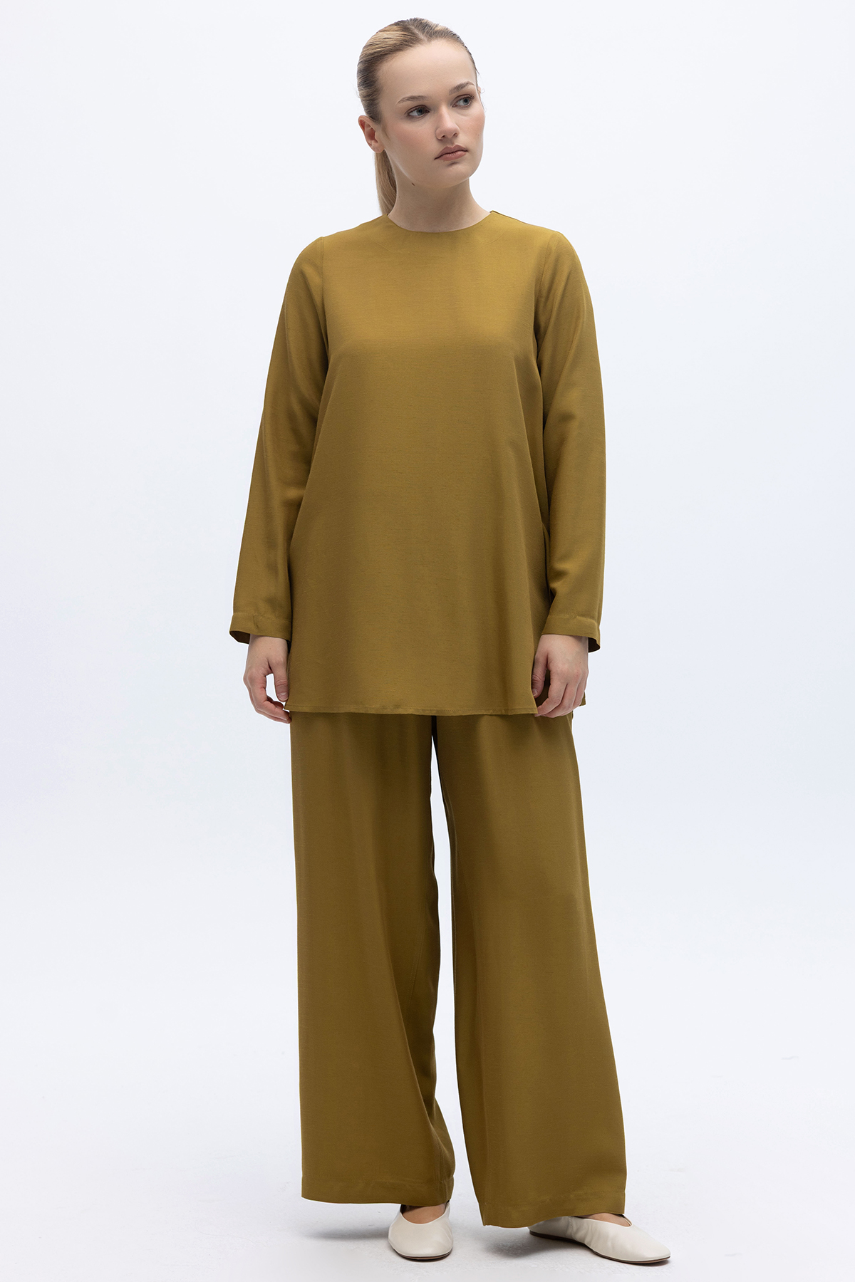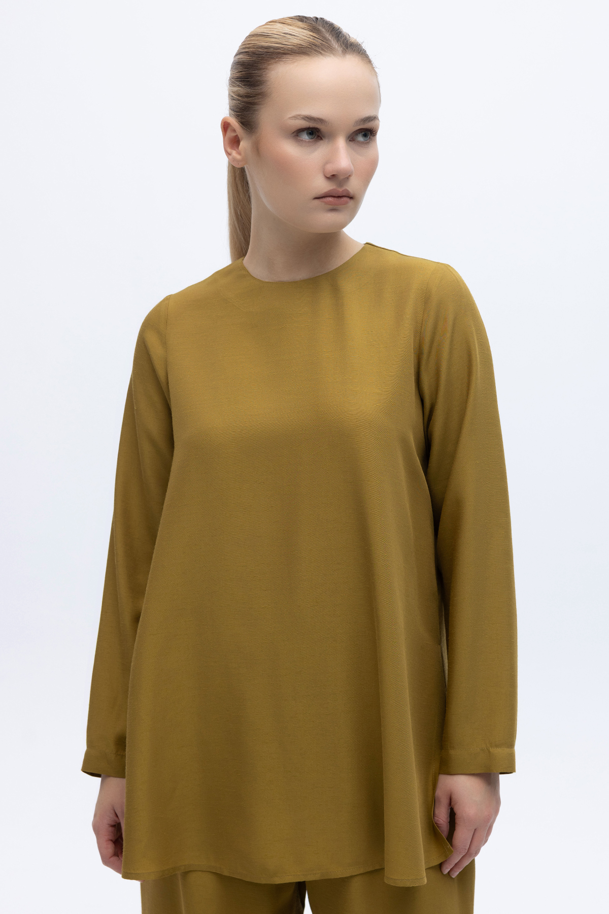 Yanı Yırtmaçlı Uzun Kollu Keten Tunik Amber