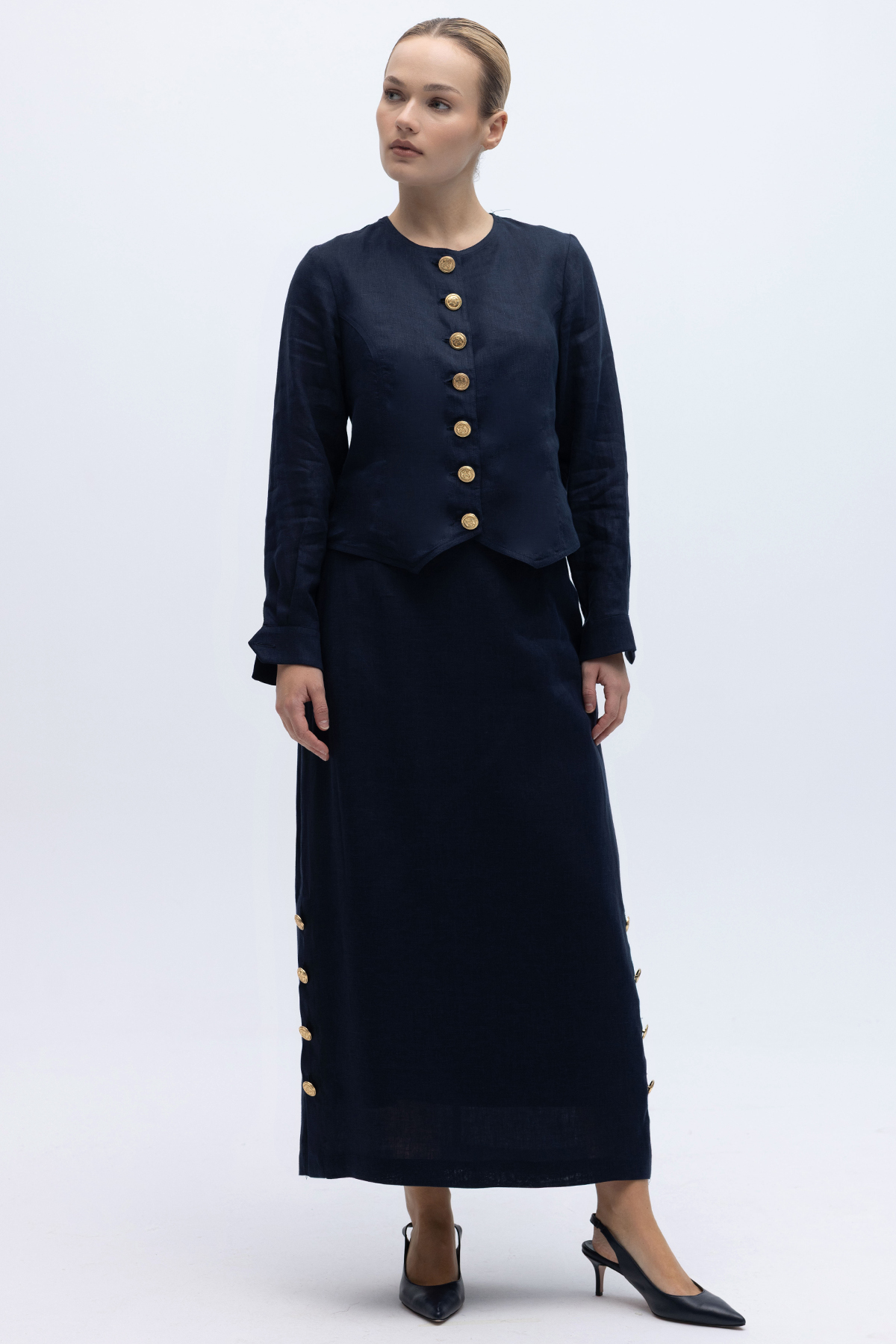 Yanları Düğmeli Düz Renk Keten Etek Siyah
