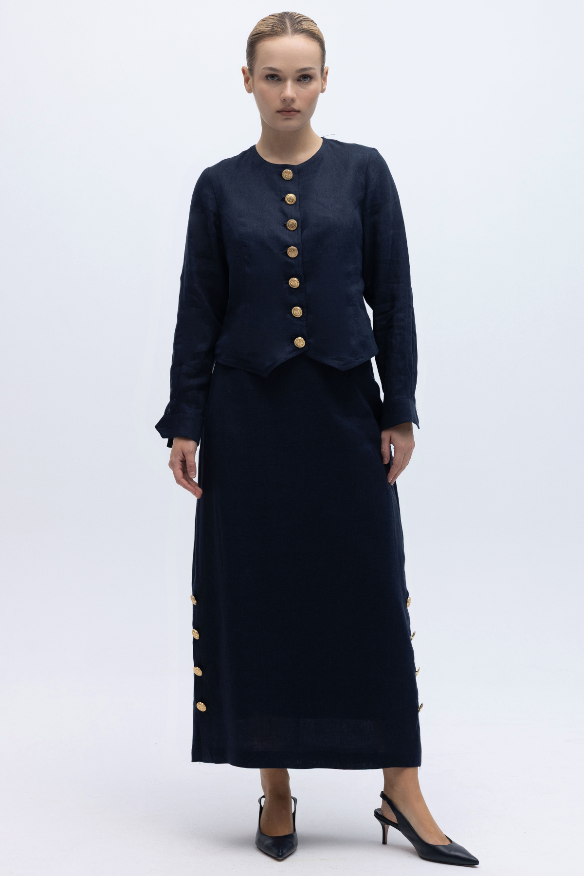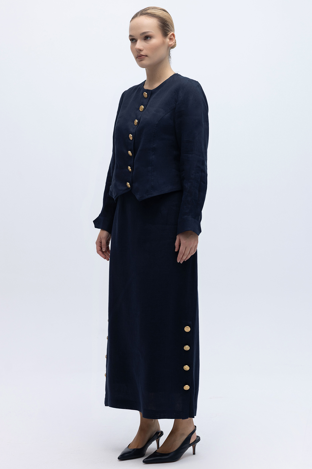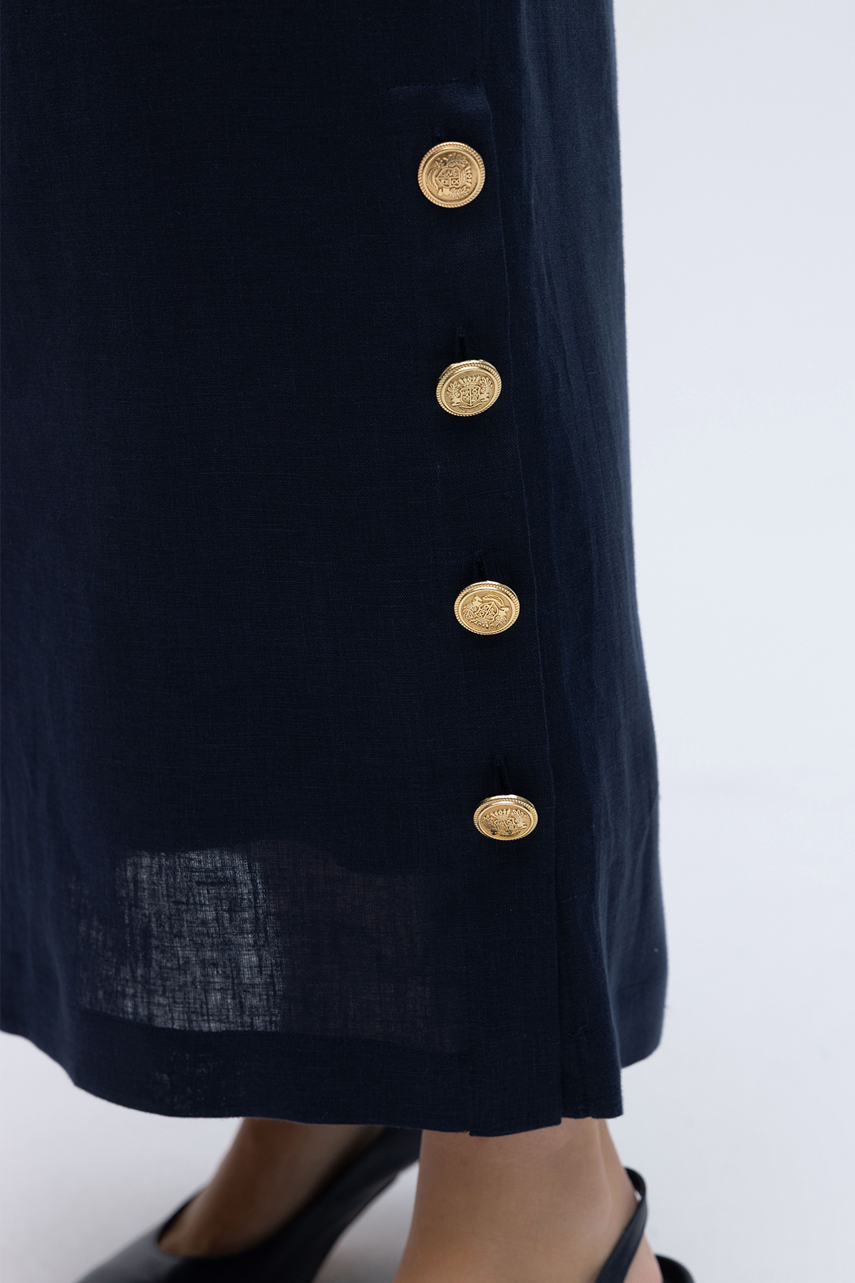 Yanları Düğmeli Düz Renk Keten Etek Lacivert