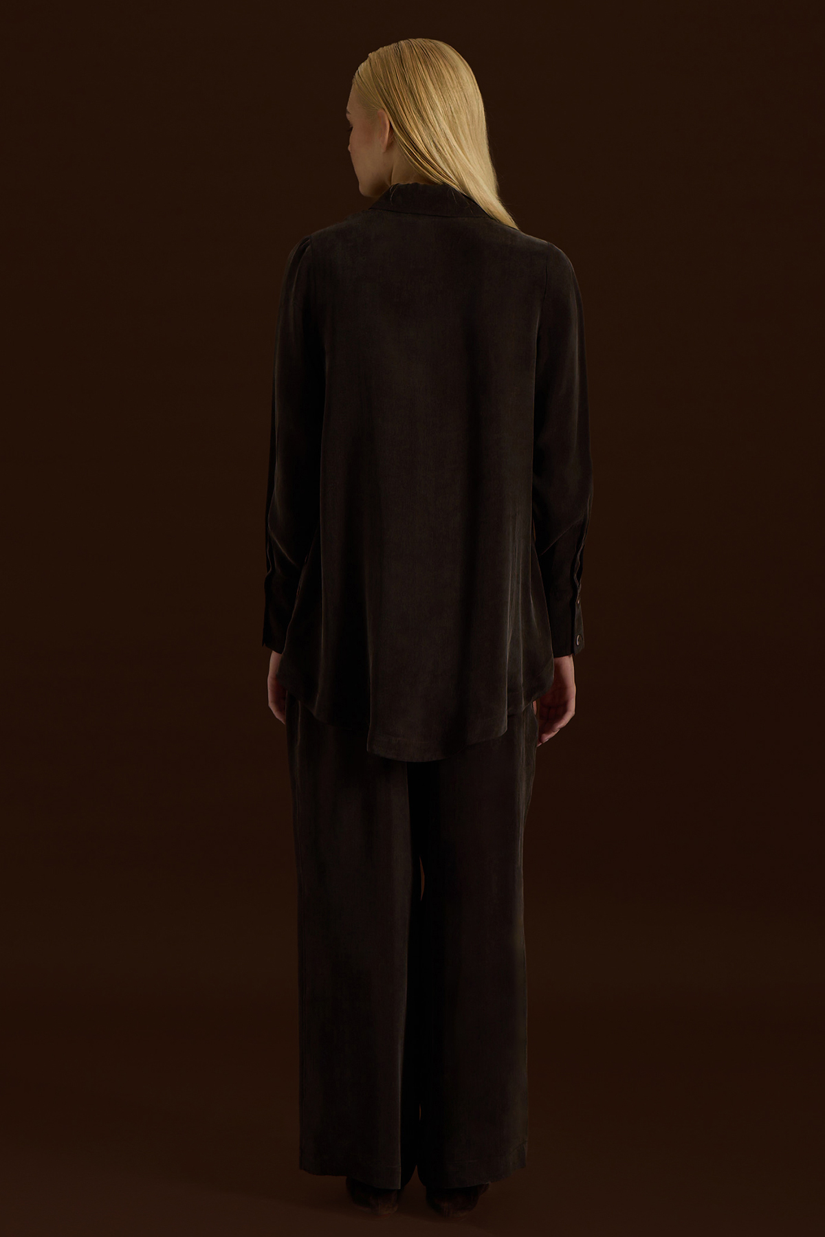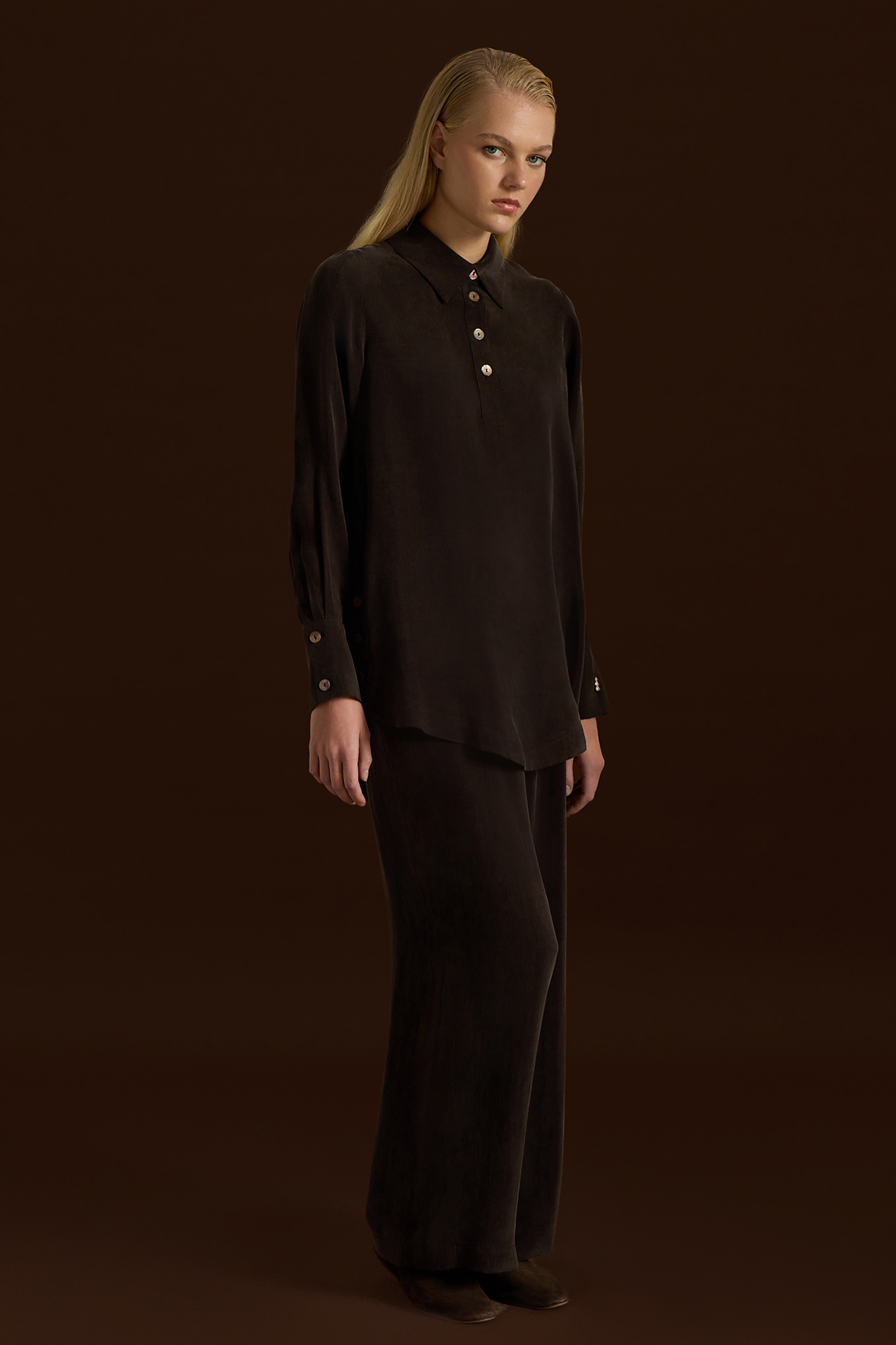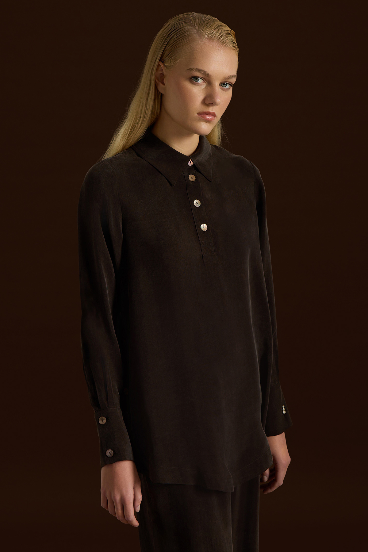 Yanları Düğmeli Gömlek Yaka Cupro Tunik Kahverengi