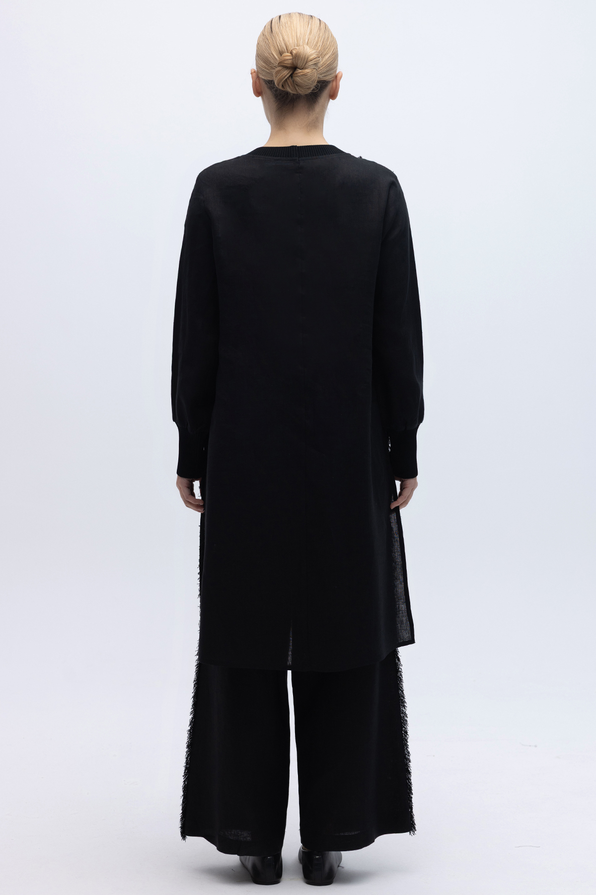 Yanları Püsküllü Bol Paça Keten Pantolon Siyah