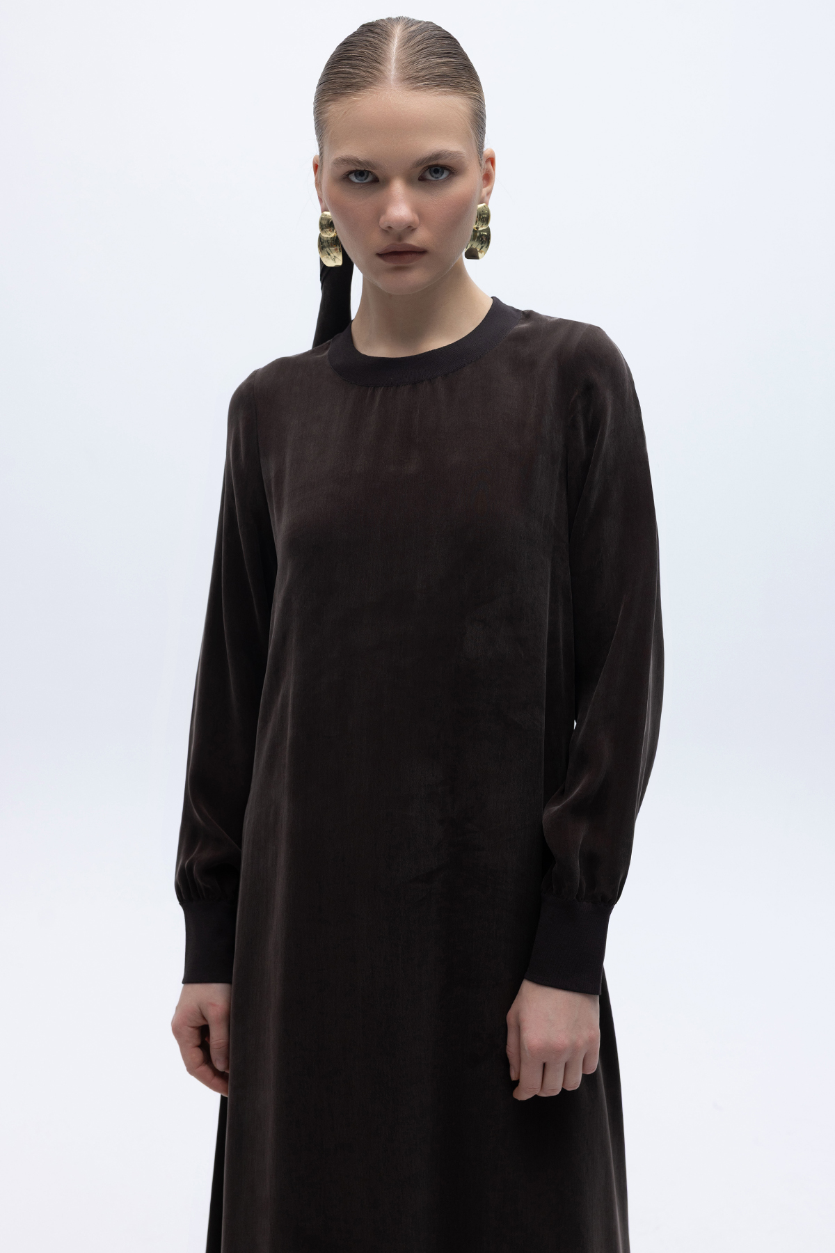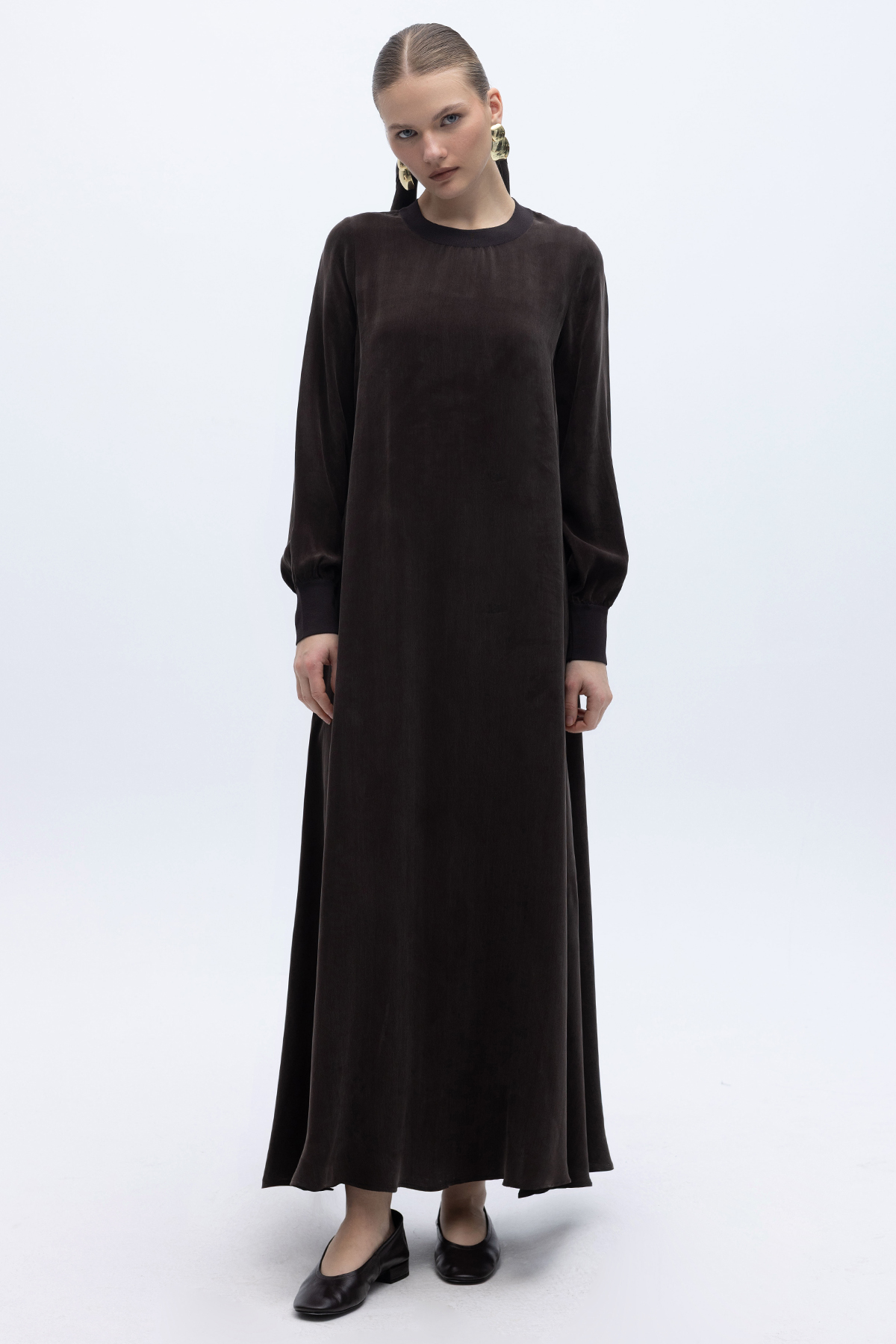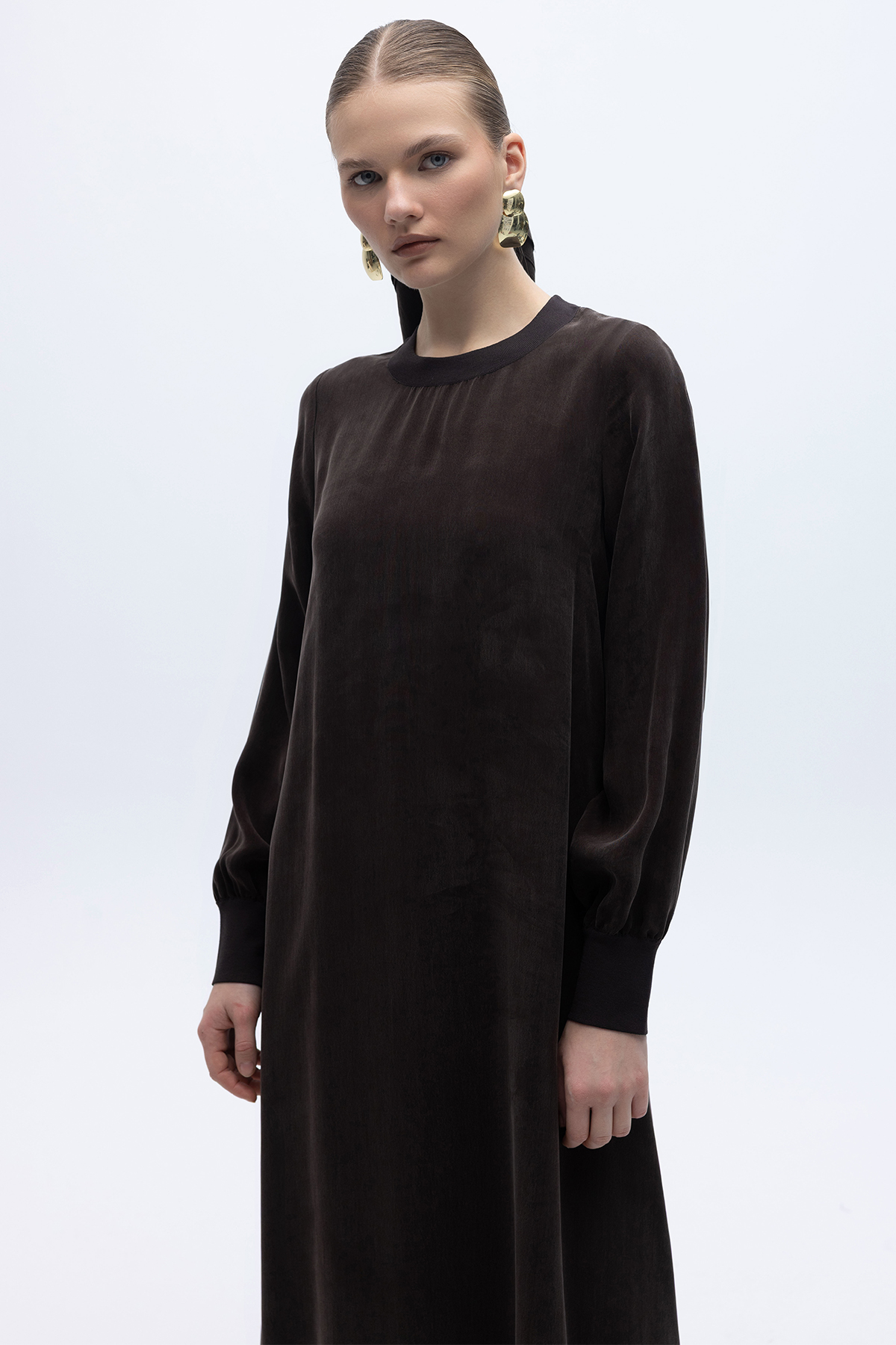 Yuvarlak Yaka Cupro Uzun Elbise Kahverengi