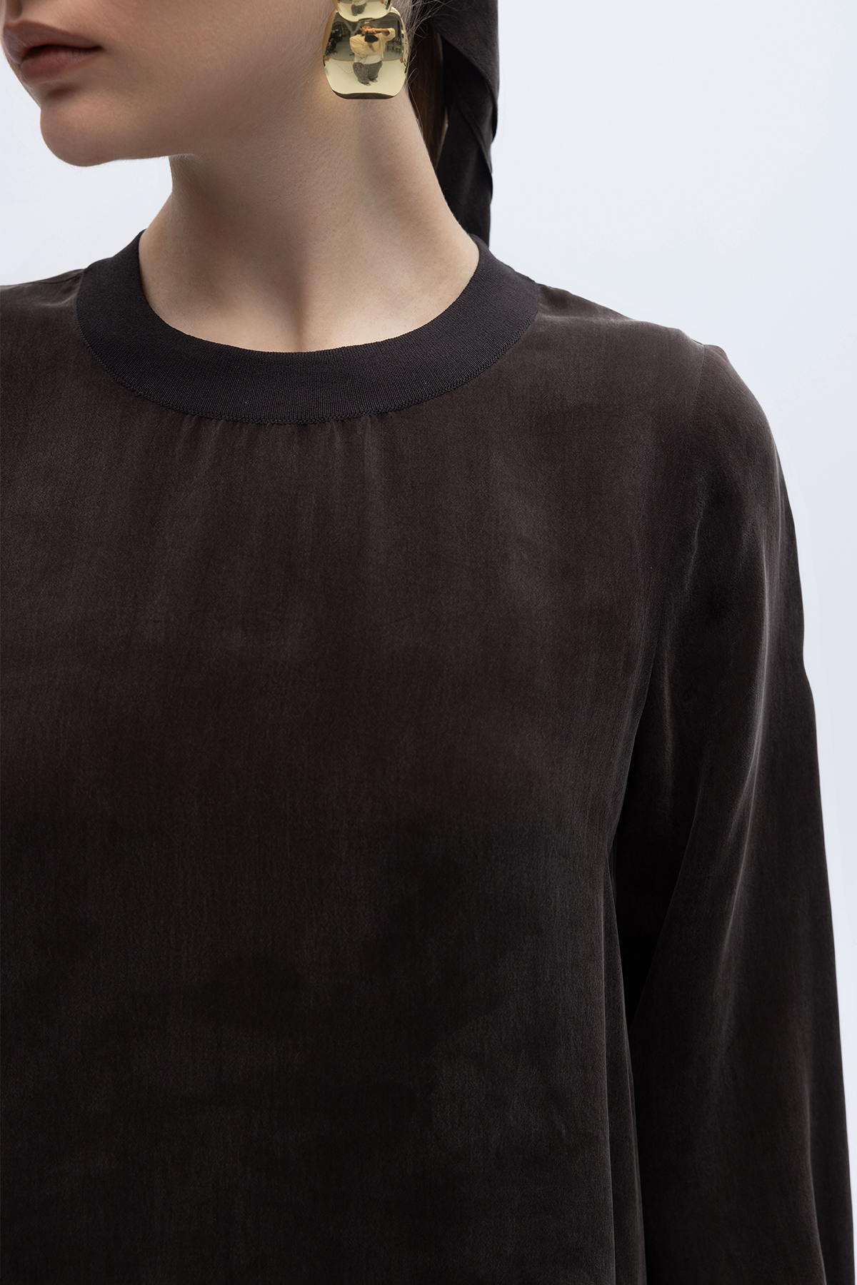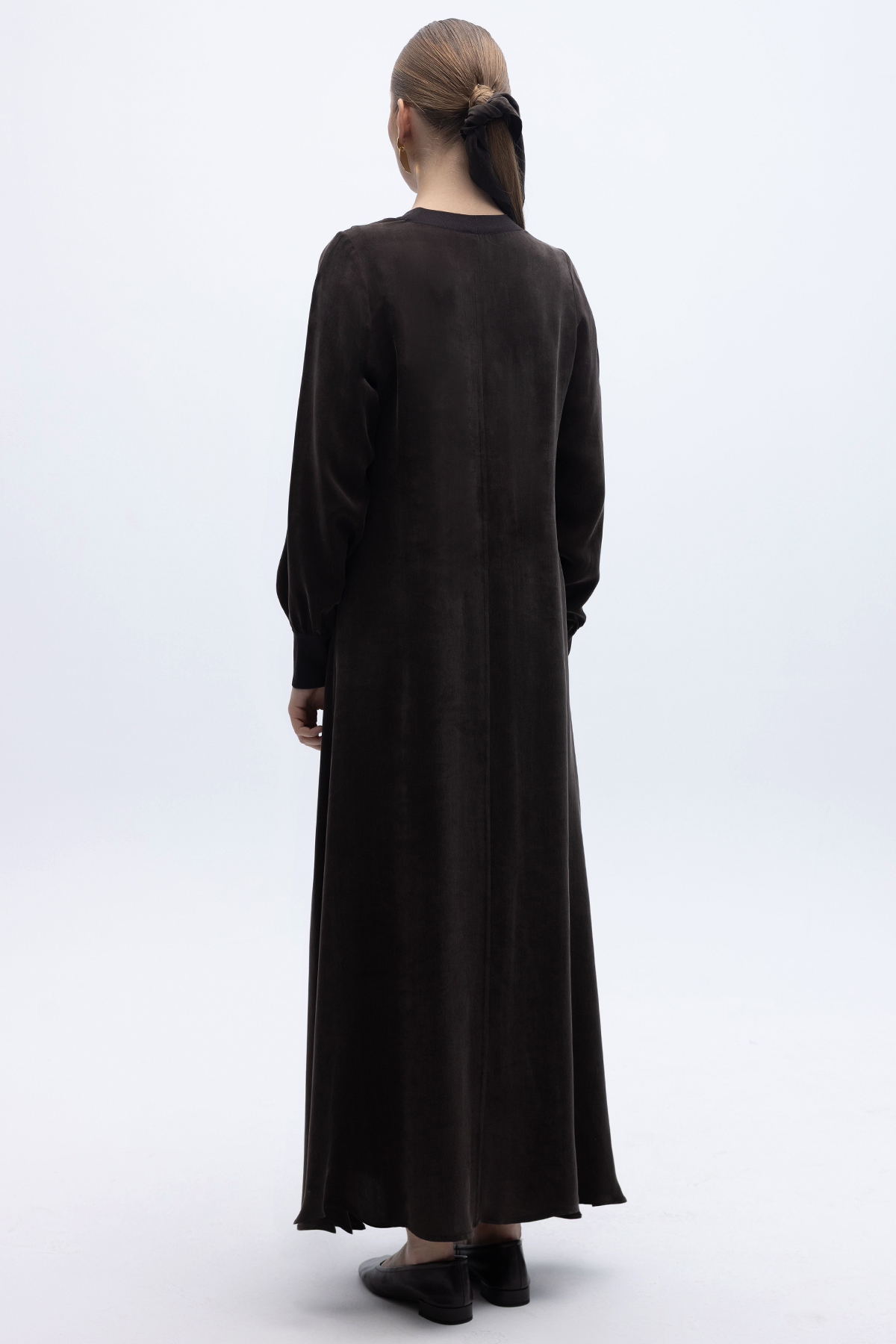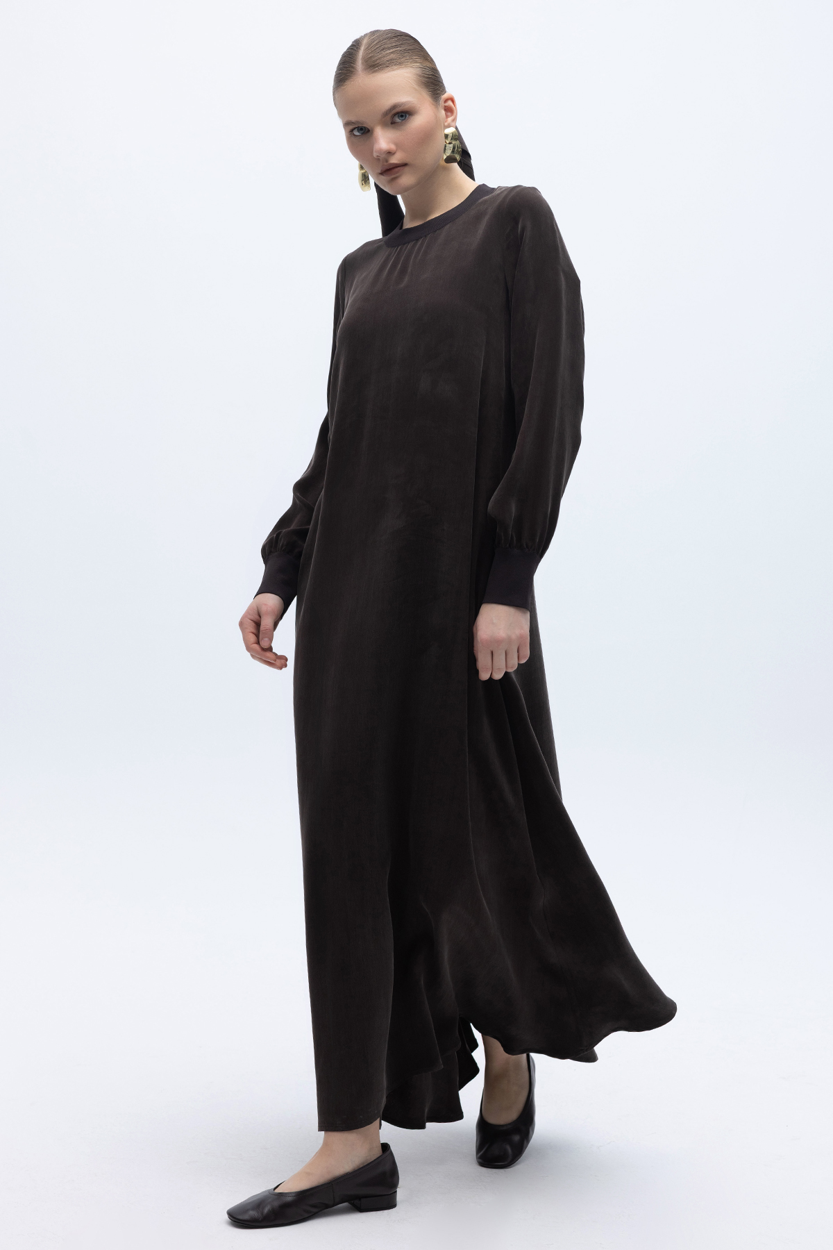 Yuvarlak Yaka Cupro Uzun Elbise Kahverengi
