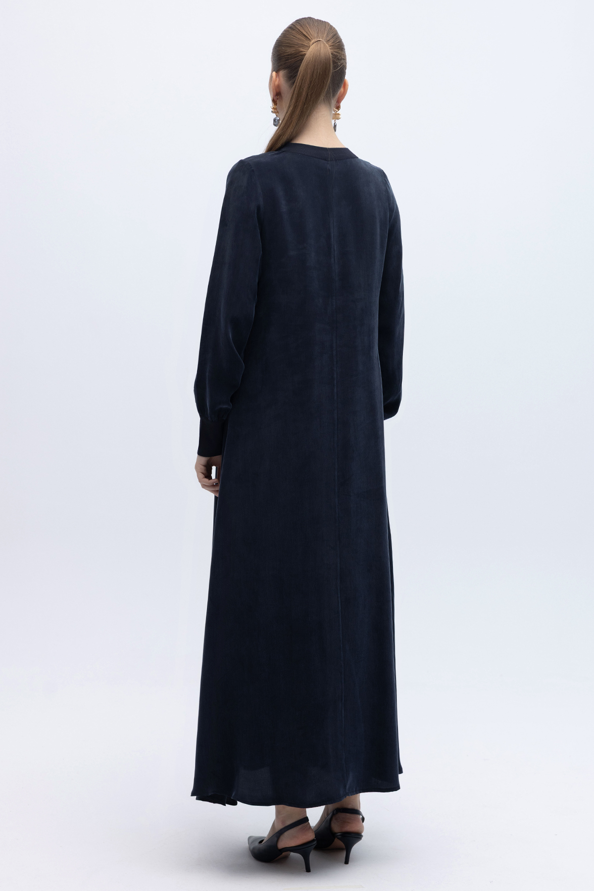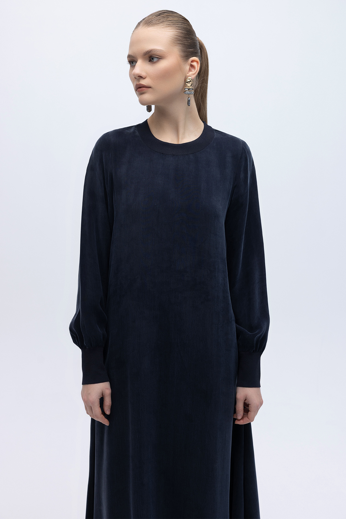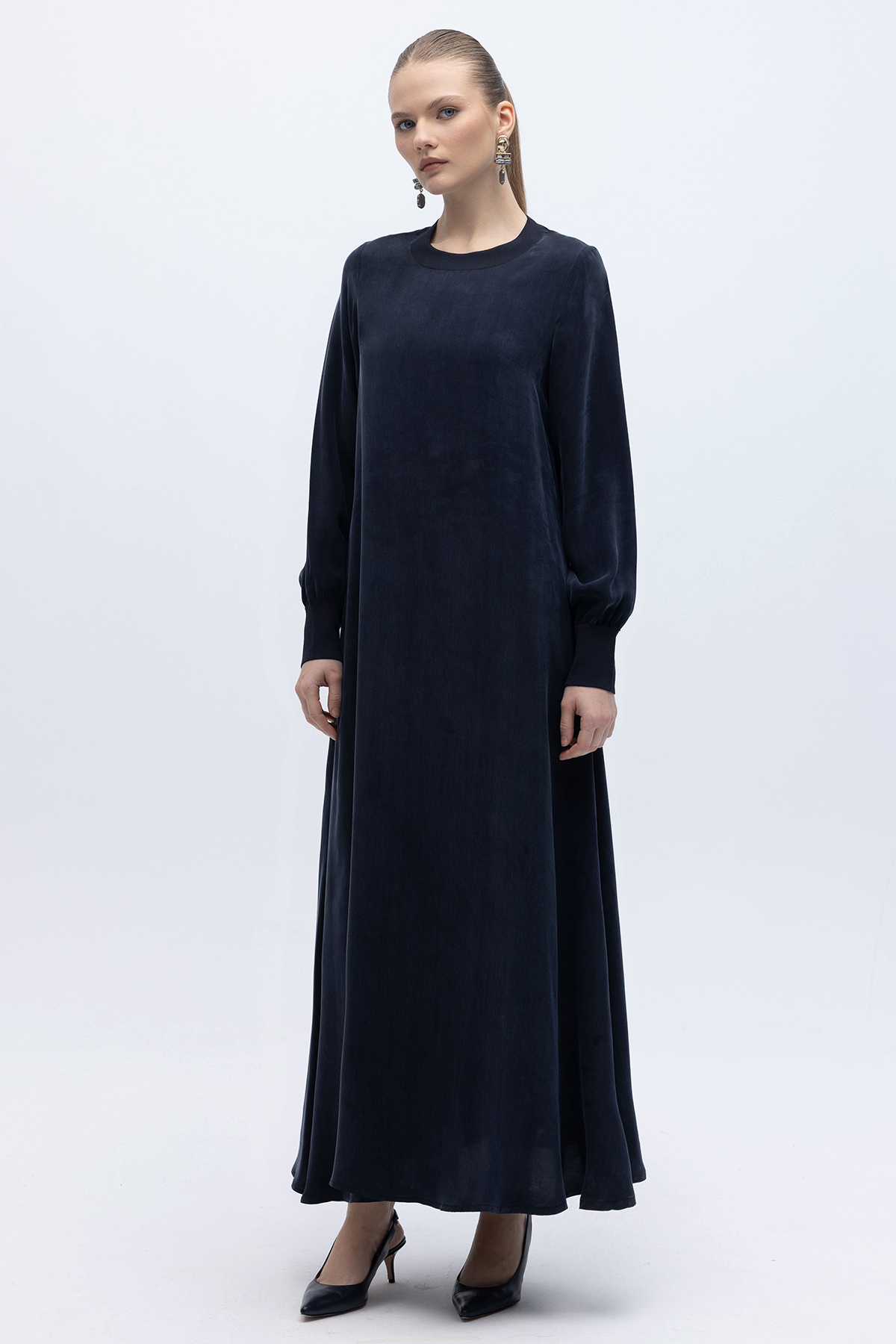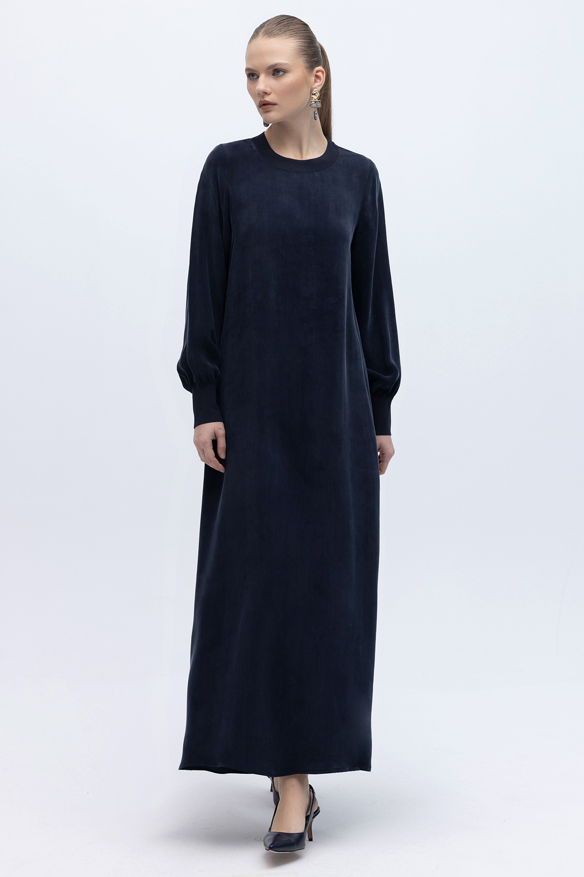 Yuvarlak Yaka Cupro Uzun Elbise Lacivert